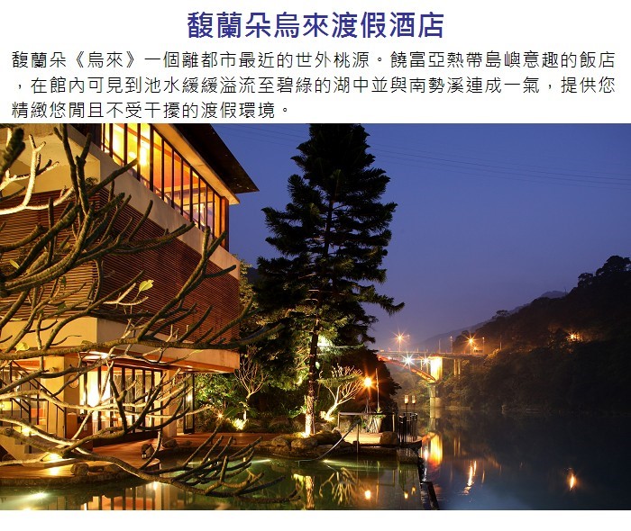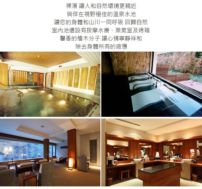 一個離都市最近的世外桃源。饒富亞熱帶島嶼意趣的飯店,在館內可見到池水緩緩溢流至碧綠的湖中並與南勢溪連成一氣,提供您精緻悠閒且不受干擾的渡假環境。緊臨河岸的溫泉空間,包括極具巧思的景觀湯屋與百餘坪的室內與戶外大浴場。在一個最貼近自然的SPA個人專屬芳療空間裡,更能享受到專業貼心的芳香療程服務。