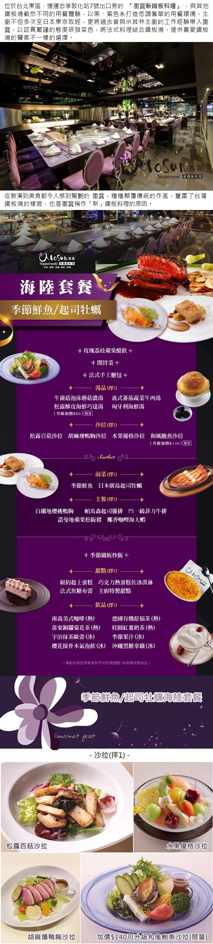 【台北】墨賞新鐵板料理 - 季節鮮魚或起司牡蠣海陸套餐(2張組↘)