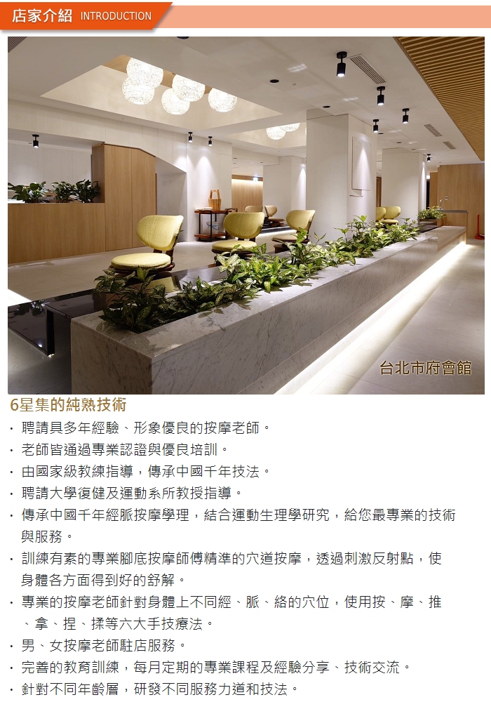 結合中國傳統按摩技法與運動生理學,並用最精準的穴道按摩技法,讓您達到紓經活絡、提神醒腦、心情放鬆、通體舒暢的境界。