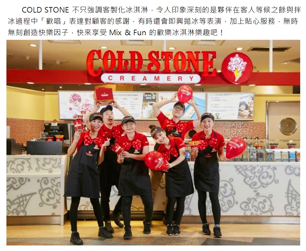 源自於美國,憑著新鮮現作的優質冰淇淋,加上1200萬種的創新客製化口味,已讓 COLD STONE CREAMERY 被喻為是『世界上最無與倫比的冰淇淋體驗』!COLD STONE 以提供顧客享用冰淇淋的歡樂體驗為宗旨,並藉由熱情及創意的營運模式,使人們感到幸福快樂~我們要成為最優質最專業及最受歡迎的冰淇淋品牌,引領食尚潮流!