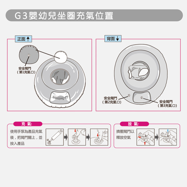 - 充氣時,請先充後背靠墊,之後充氣坐圈主體,最後再沖氣底層品牌名稱位置