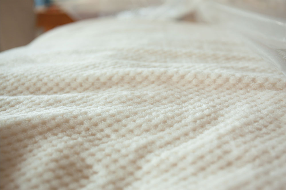 市面上一般的毯子大都以『起毛』為主流。藉由破壞布料的表面、製造出絨毛的觸感。雖然有了柔軟的質感,但布料損害會導致使用一段時間後出現鬆散、掉毛的狀況。且一般的絨毛被或是絨毛材質安撫被多是使用化纖製成,除了容易掉毛造成呼吸道過敏, 還有保暖卻很悶熱的問題,並不適合皮膚敏感或嬰幼兒。