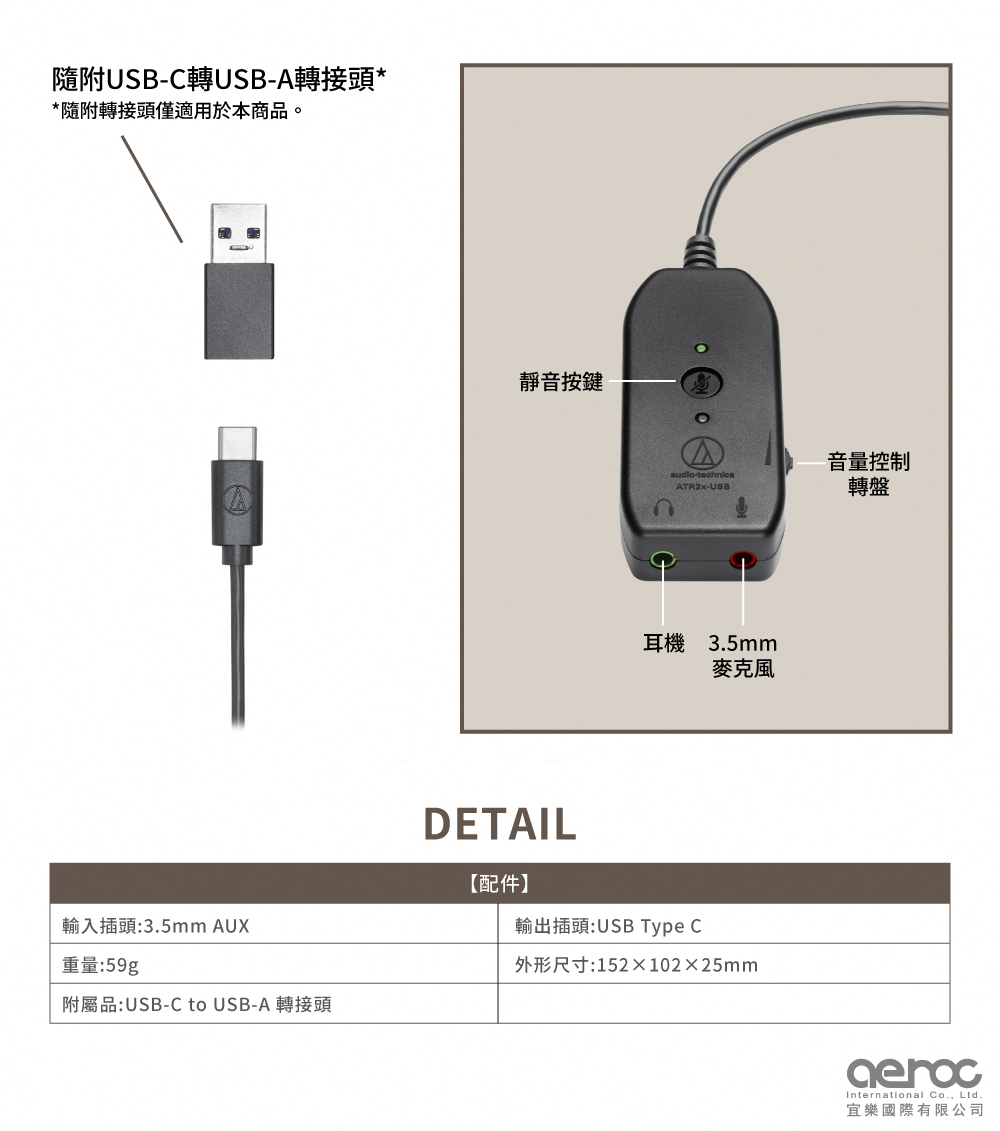 日本Audio-Technica鐵三角USB音效卡音訊卡ATR2XUSB耳機連接器/麥克風轉接器(USB-C/A轉成3.5mm耳機MIC端子)audio介面