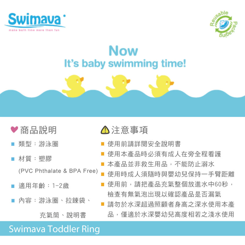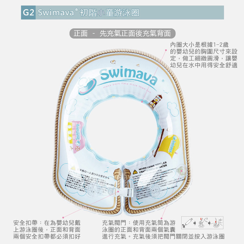 - 請留意使用任何一款泳圈,當寶寶拍水時須隨時留意寶寶重心,避免翻覆