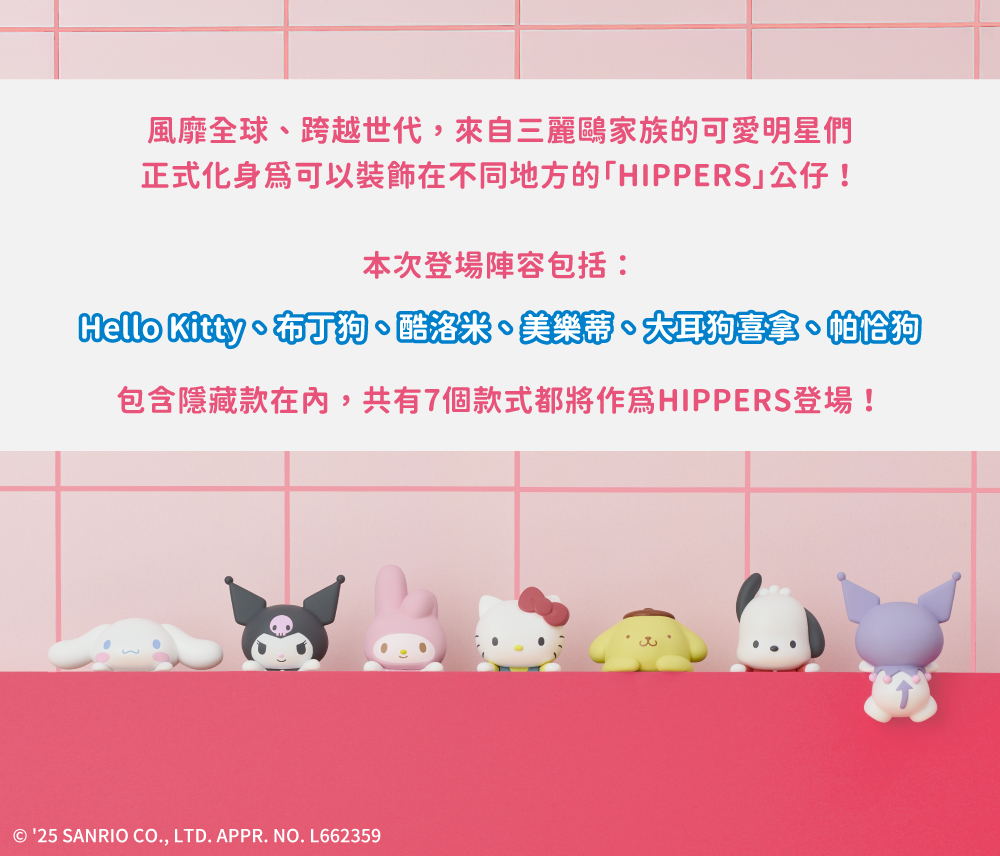 Hello Kitty、布丁狗、酷洛米、美樂蒂、大耳狗喜拿、帕恰狗--包含隱藏款在內,共有7個款式都將作為HIPPERS登場!