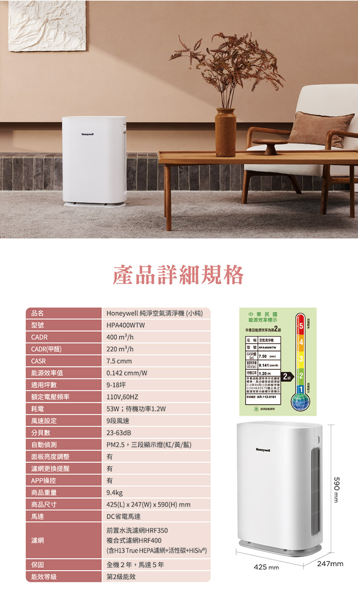 (贈濾網)HPA400WTW純淨空氣清淨機