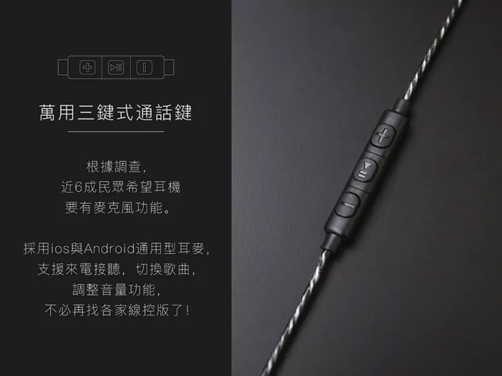 支援iOS及Android通用耳麥線控的設計也是本款耳機的強項,支援來電接聽、切換歌曲和音量調整功能,大幅提升使用者好感度;不打結的雙邊織線為耳機本身提供極佳手感,平滑緊實的線材能夠防扯、加上回彈力極佳的按鍵,被譽為市場上競爭力十足的黑馬真的實至名歸。