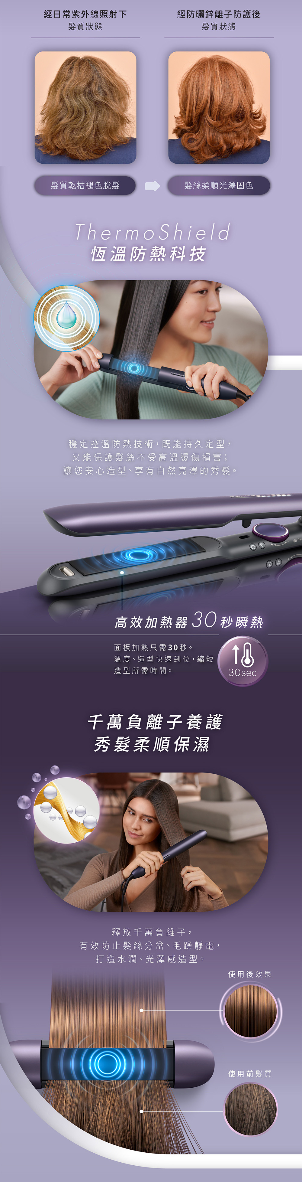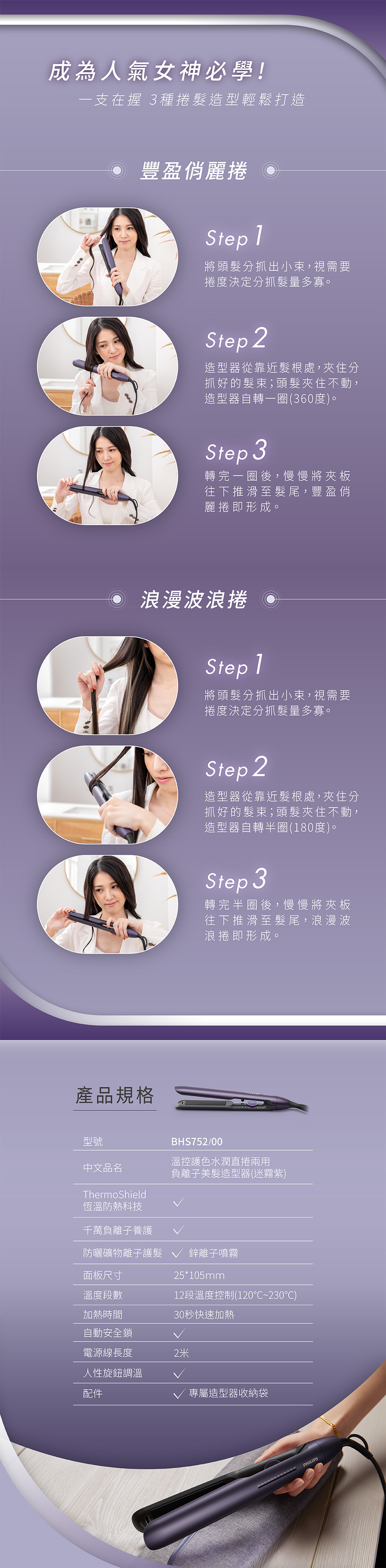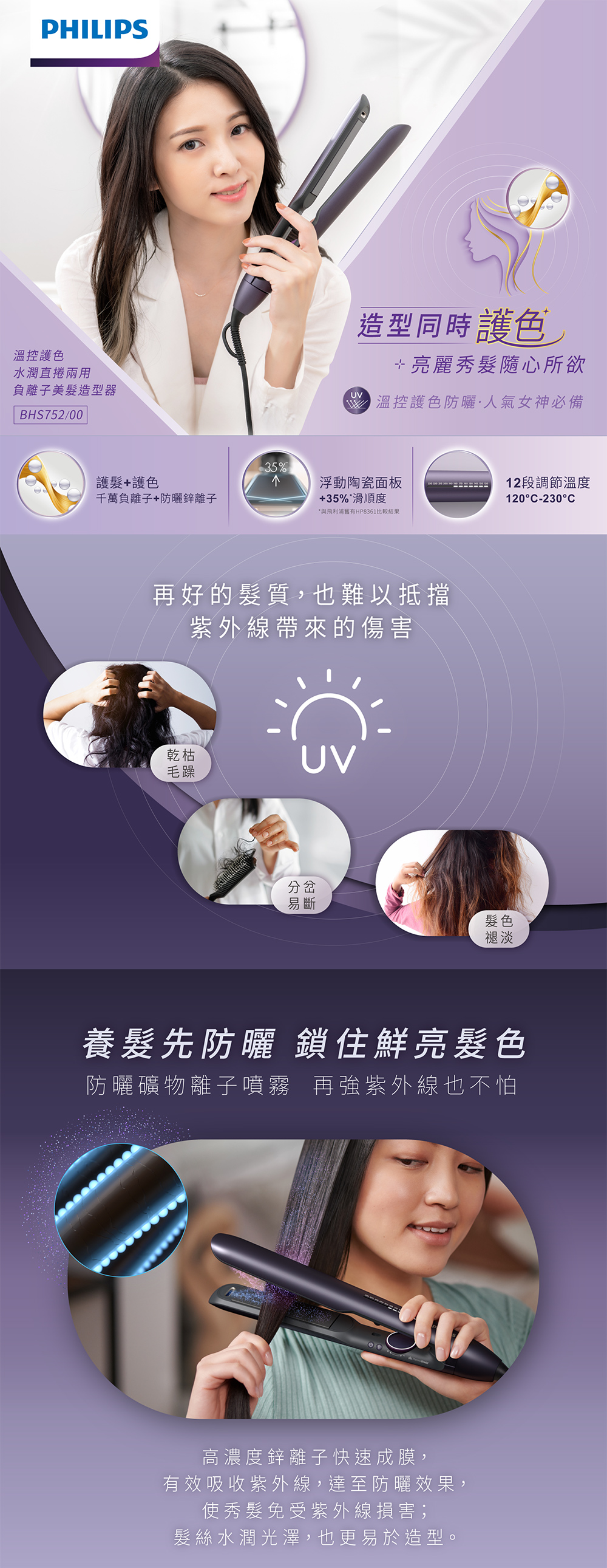 買就送胺基酸精華髮油【Philips 飛利浦】溫控護色水潤直捲兩用負離子美髮造型器 (BHS752)