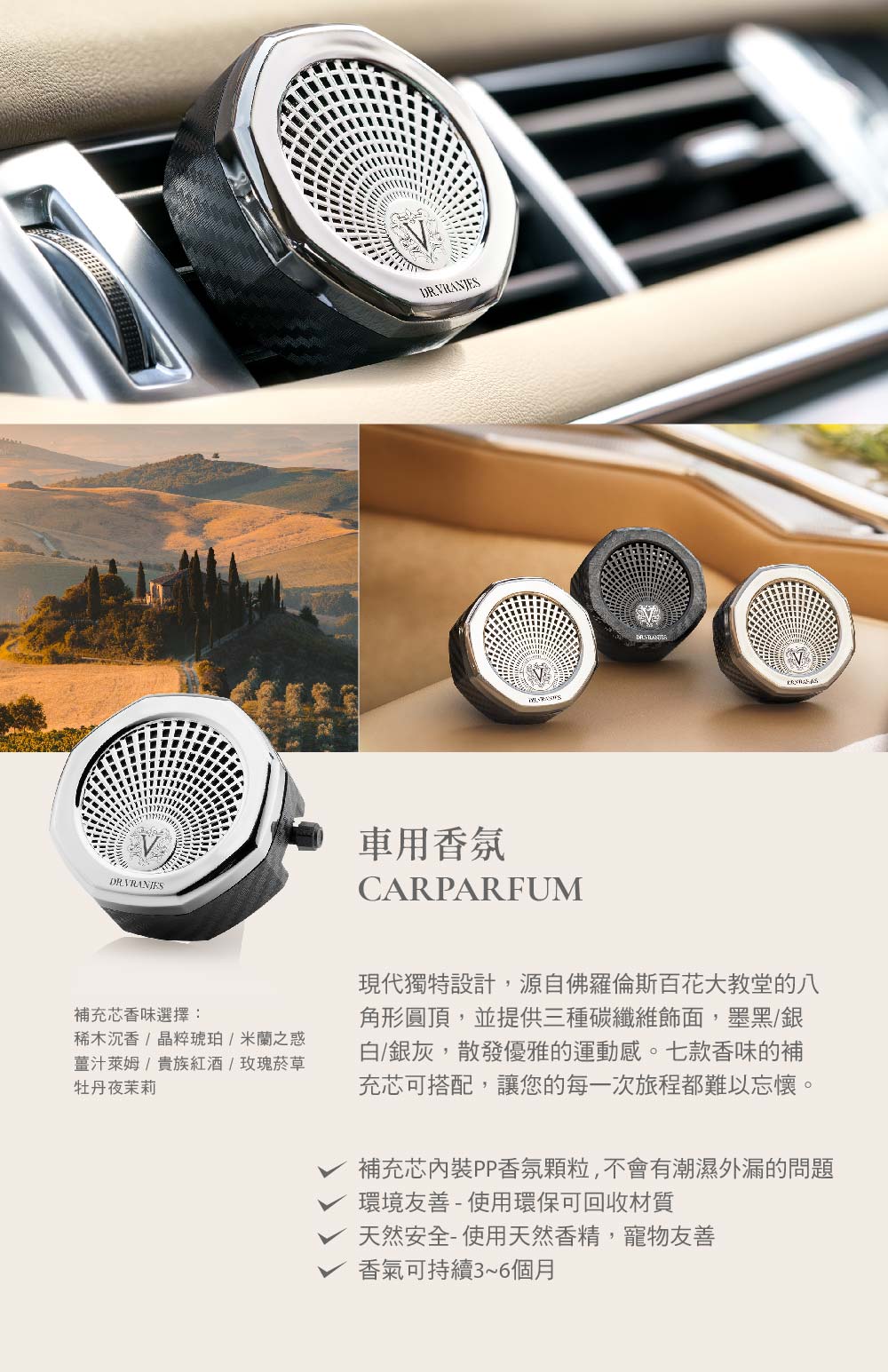 車用擴香器提供三種顏色:墨黑(碳纖維)、銀灰(鍍鎳)和銀白(鍍鉻)。 請根據您的汽車內裝來選擇適合的樣式。