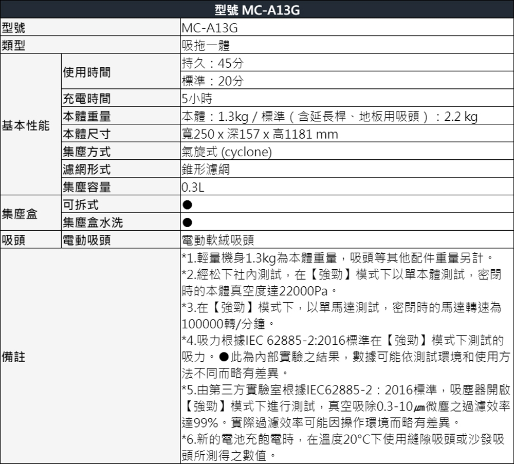 Panasonic國際牌 輕量型無線吸塵器MC-A13G