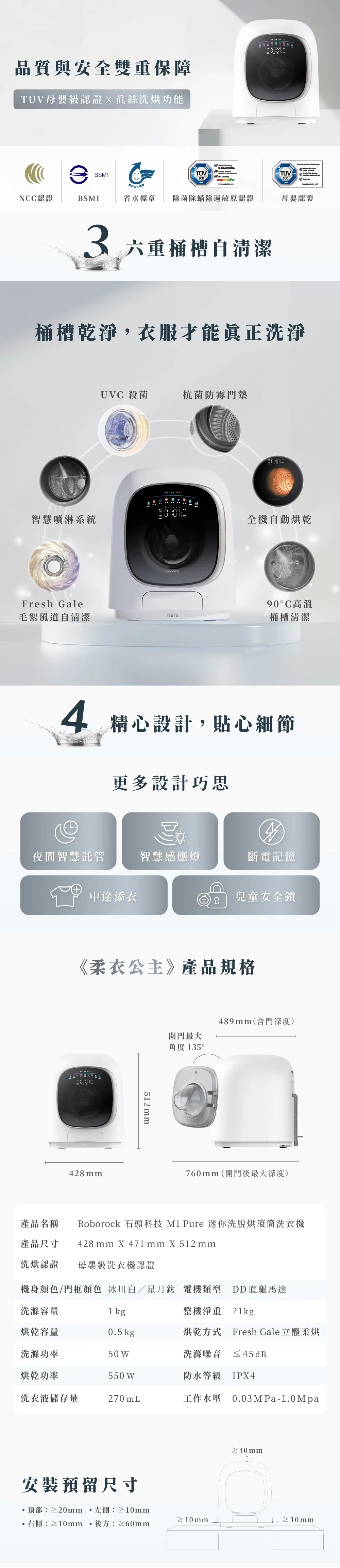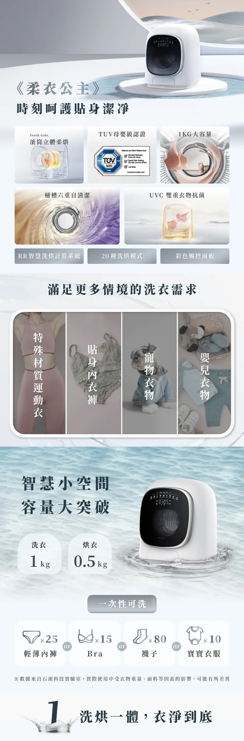 【11/14-11/27 LINE購物下單,享1%LINE POINT回饋】柔衣公主 M1 Pure 1KG 迷你洗脫烘 AI 滾筒洗衣機(特漬洗/立體柔烘/母嬰認證/UVC殺菌)