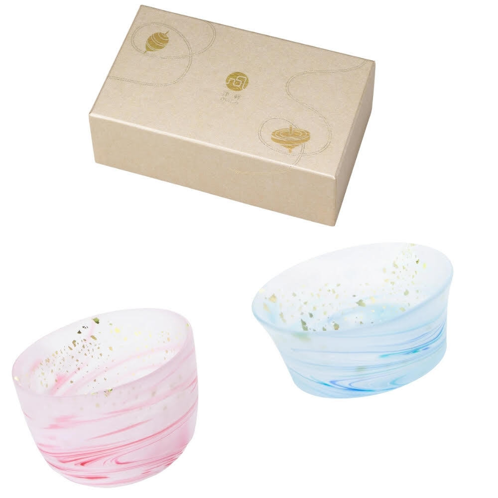 這組兔與波的日本手作不倒翁杯,將兔子跳耀的移動身影與櫻花飄落的粉紅色景象,結合呈現於杯身,另外以水藍波浪紋路的流動融入杯身設計,搭配口部金箔營造華貴光澤,其磨砂玻璃質感更營造出獨一無二的風格。使用時搖轉杯體,令香味四溢同時,也如同招來好運以及平安。