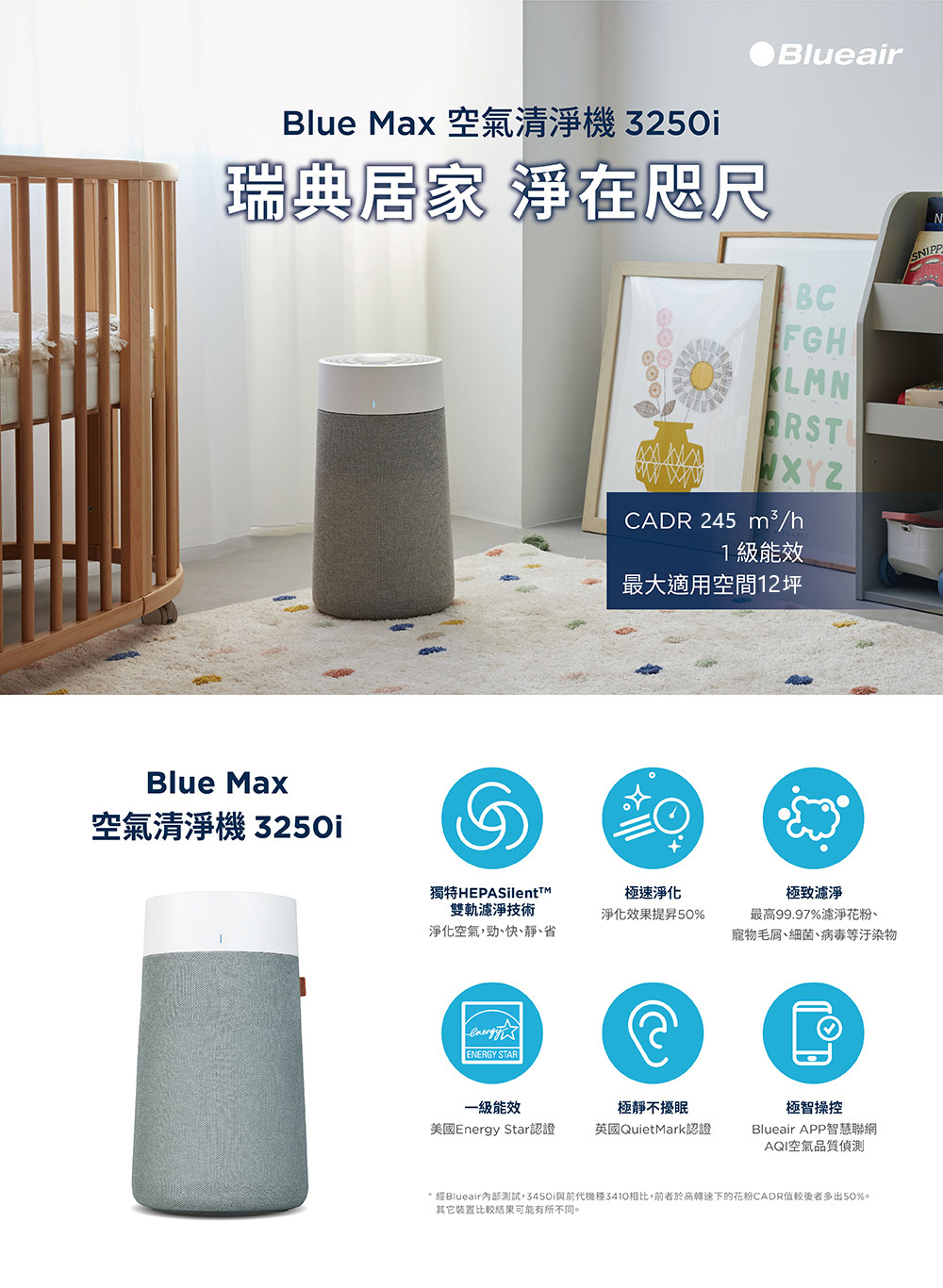 A5. CADR是Clean Air Delivery Rate的簡稱,即潔淨空氣輸出率。CADR值越高,代表空氣清淨機輸出的潔淨空氣量愈高,適用的坪數愈大;Blueair空氣清淨機依權威機構美國家用電器製造商協會AHAM定義,以每小時空氣交換4.8次的標準測量CADR值,並依此建議最佳使用坪數。在最高轉速下,BlueMax™ 3250i每隔大約 12.5 分鐘徹底淨化一次六坪之室內空氣,建議使用坪數10坪以內中型房間,如小孩房或起居室。\t\t\t\t