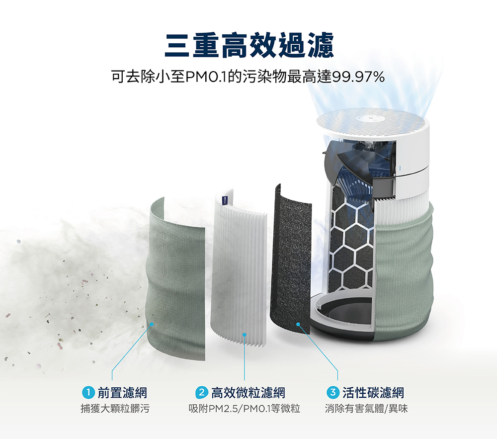 A2. 前置濾網可水洗進行清潔。清洗後需充分晾乾。主濾網需依濾網更換指示燈或Blueair APP應用程式提醒更換。請勿以任何方式如以吸塵器清潔或水洗等方式清潔主濾網,以免損壞濾網材料並降低性能。\t\t\t\t