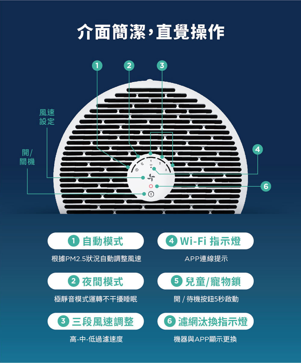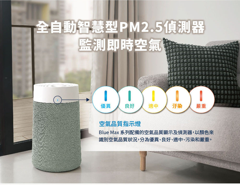 A4. 內建PM2.5偵測器可測量房間內的細懸浮微粒 (PM2.5) 水平,並會根據當前空氣品質狀況變換空氣品質指示燈 (AQI) 的顏色(位於空氣清淨機的正面)。空氣品質指示燈會顯示五種顔色當中的其中一個顔色,分別是:紅色(嚴重汙染)、橙色(輕微汙染)、黃色(適中)、綠色(良好)和藍色(優異),以表示空氣品質。\t\t\t\t