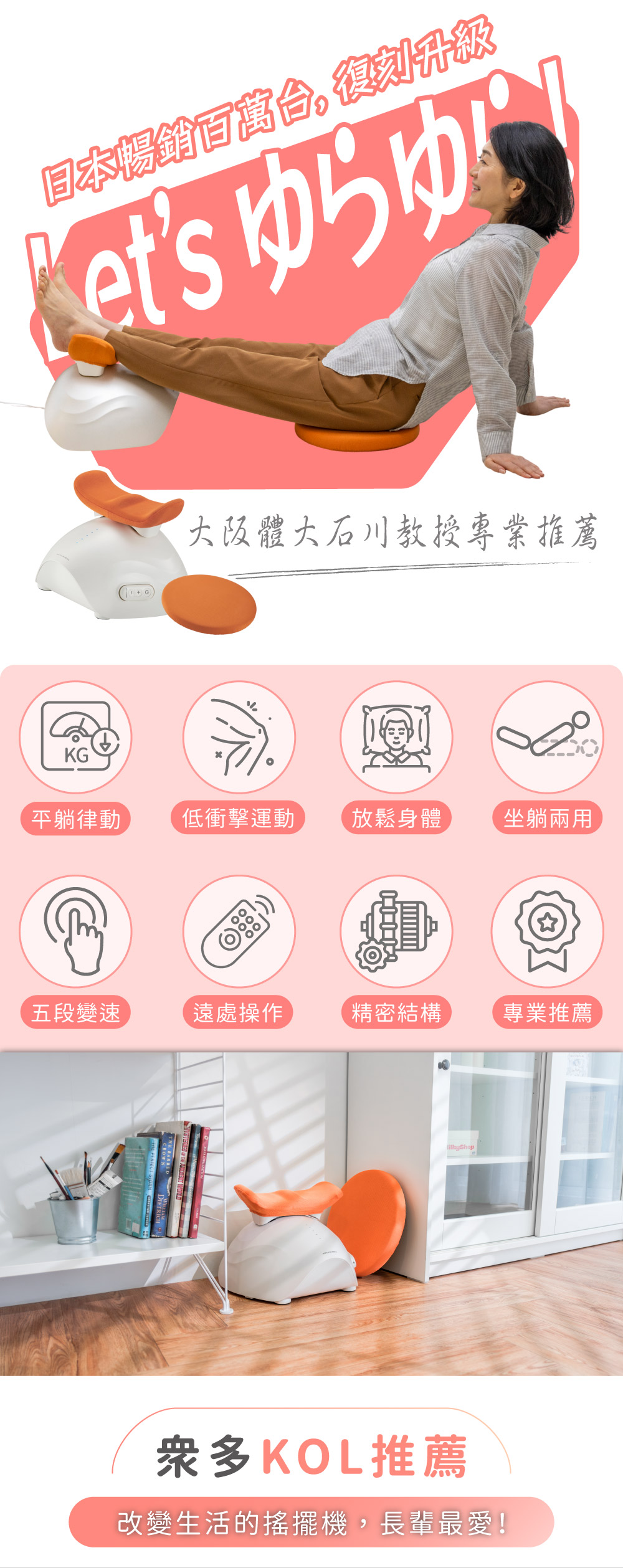 日本熱銷百萬台,研發多時復刻再升級,日本工藝設計高度精密結構,以全家人都可使用的安全等級,設計複雜的逆U擺幅動作,成就耐用、低風險的律動搖擺機!