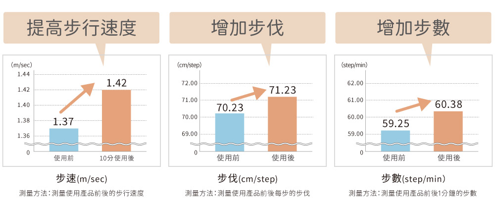 實測使用後受測者增加身體柔軟度,提高步行速度及步伐,延長運動時間。