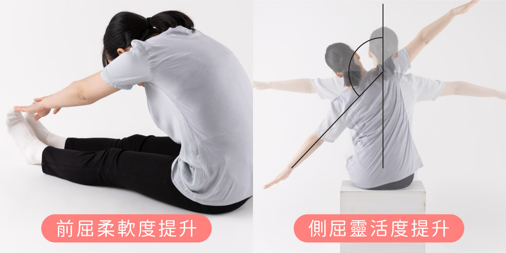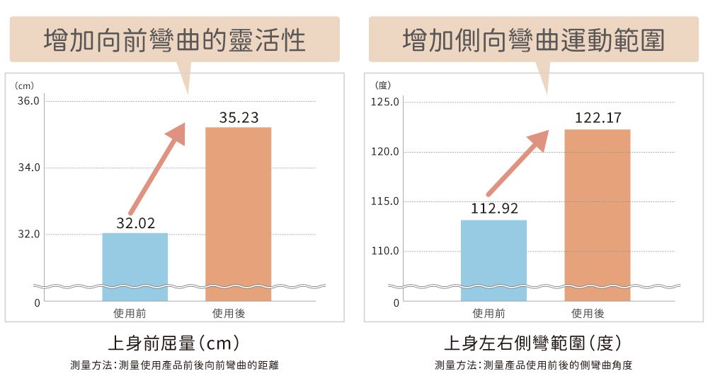 提高下半身腰腿靈活度,背部柔軟度增加,受測者使用後坐姿體前彎幅度及側彎幅度皆提高。