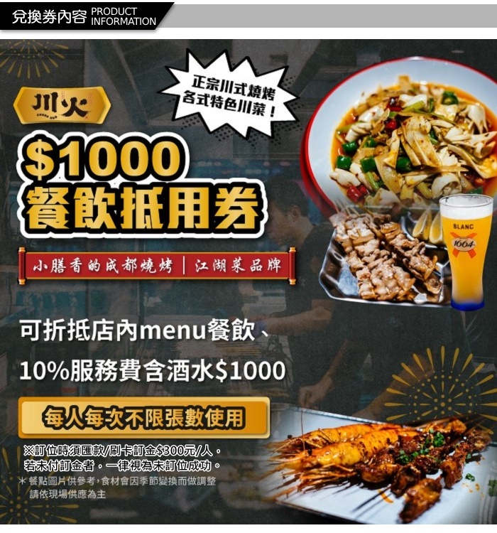 【川火成都燒烤】【台北】$1000餐飲抵用券