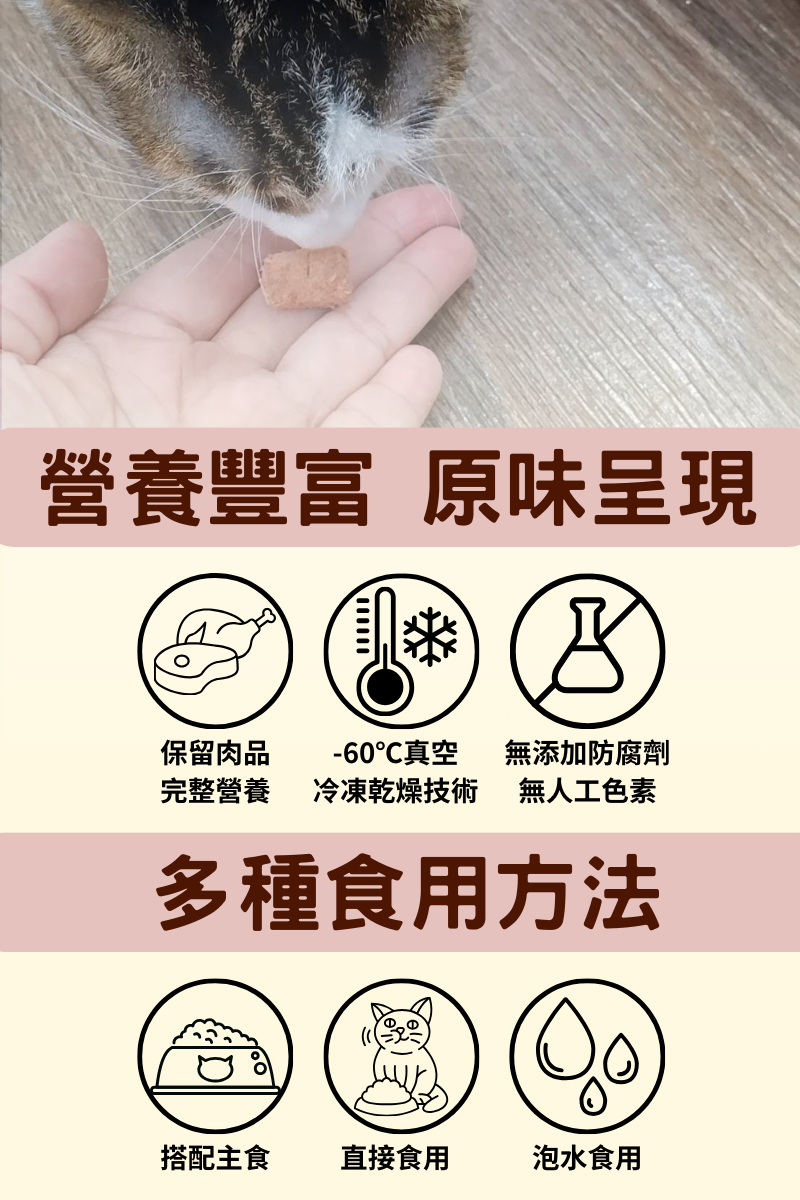 -60℃真空冷凍乾燥製成,保留肉品完整營養