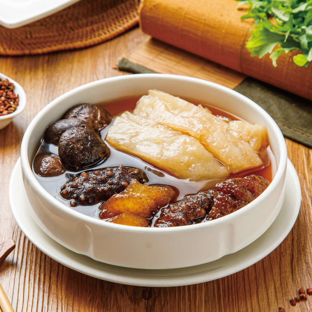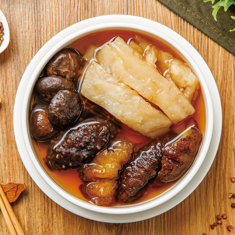 膠原蛋白聖品之烏參與花膠搭配香菇,花膠綿糯透鮮、烏參滑嫩彈口,燜煮濃郁入味,膠質滋補,養生極品。