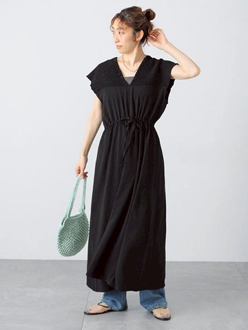 〚Green Parks〛褶皺拼接下擺法式袖洋裝