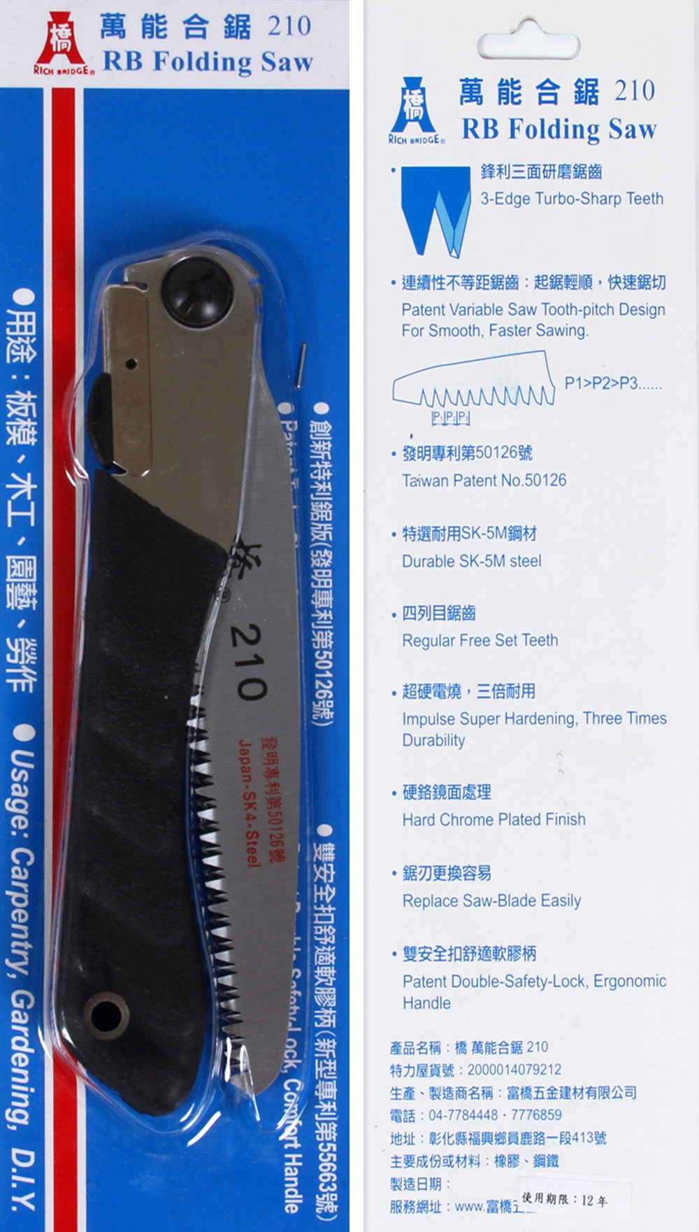 【替刃式園藝合鋸 】,面對堅固多樣的質料亦能輕鬆應對,黑色刀柄具橡膠能止滑,符合人體工學好握、方便使用,搭配雙安全扣設計,增添工作多一份的安全,折疊式設計方便收納使用,特殊專利鋸齒綿密平整的排列著,適合板模、園藝、木工、勞作使用。