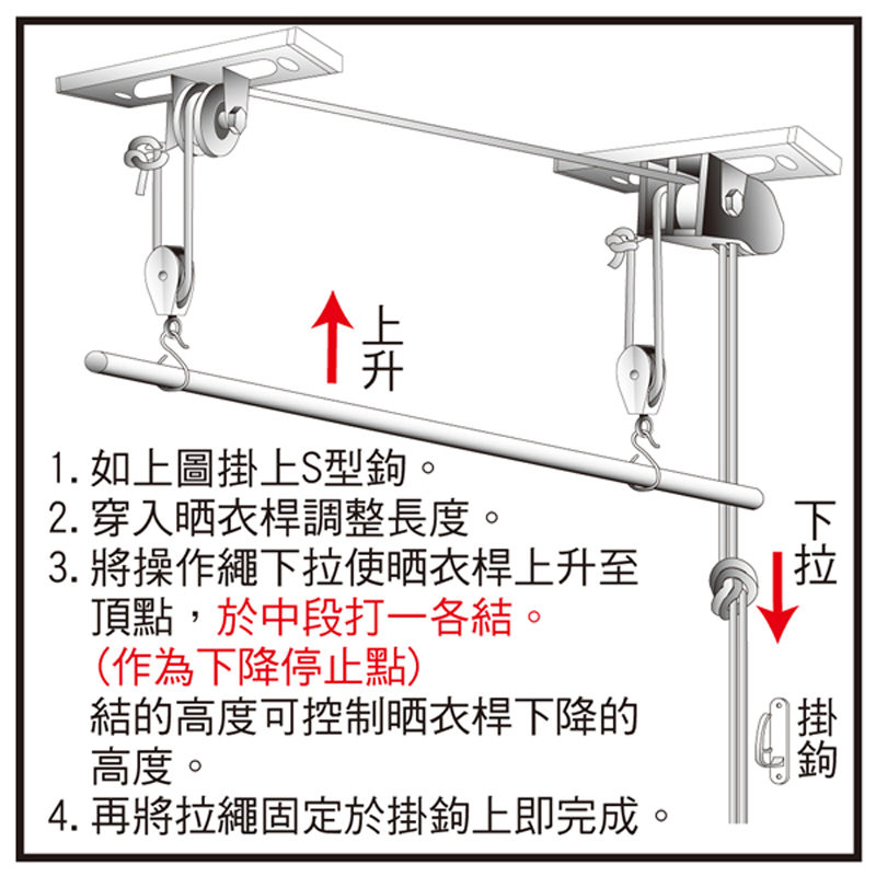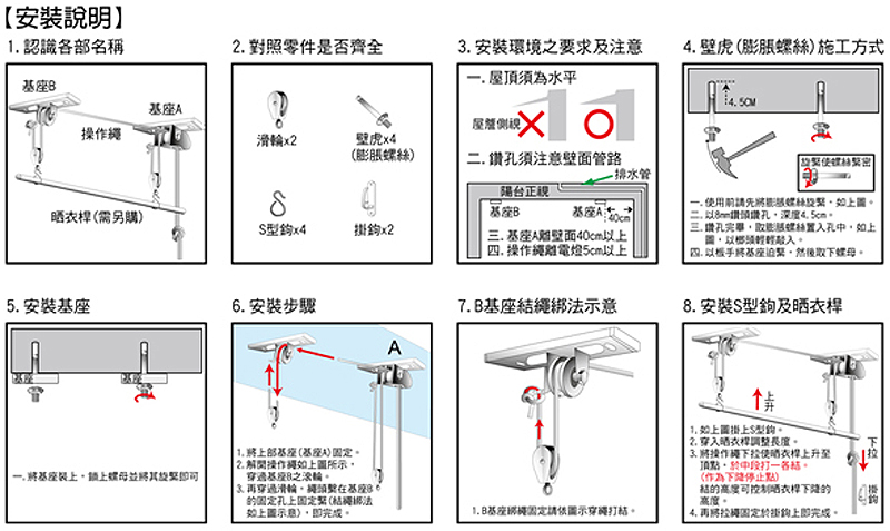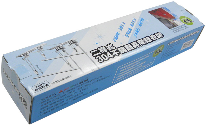 不鏽鋼材質製作,不易不生鏽 (二桿式) 。升降功能,適用性高,可隨環境改變晾衣高度增加生活空間。附完整安裝說明圖,輕鬆組裝 DIY 。