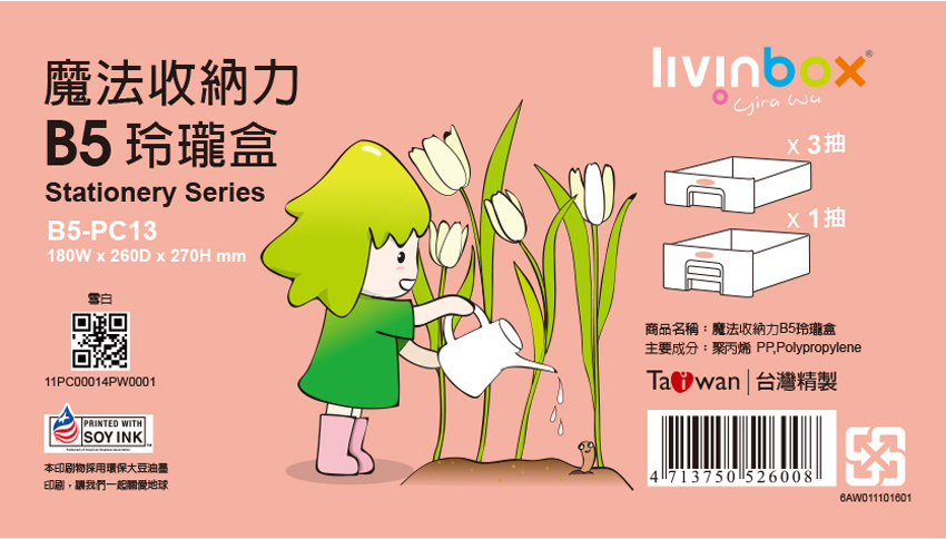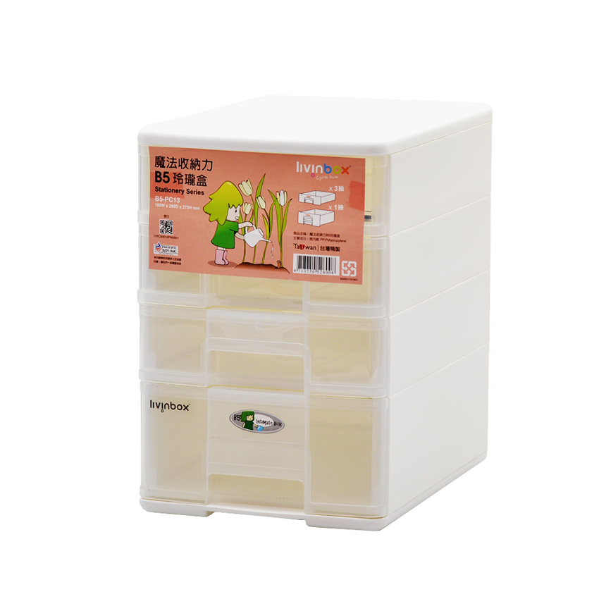各式文具零件輕鬆分類,想讓凌亂不堪的桌面,能更有效的收納整合嗎?柔和明亮的色彩搭配,適合在家中或辦公場所使用,三小格一大格抽屜設計,方便分類收納,透明抽屜讓內容物一目了然,PP塑膠材質不易損壞,堅固又耐用,不僅韌性超高,而且耐荷重,使用壽命為同類商品的三倍! 是您辦公室或家中桌上最實用又有效率的收納盒。