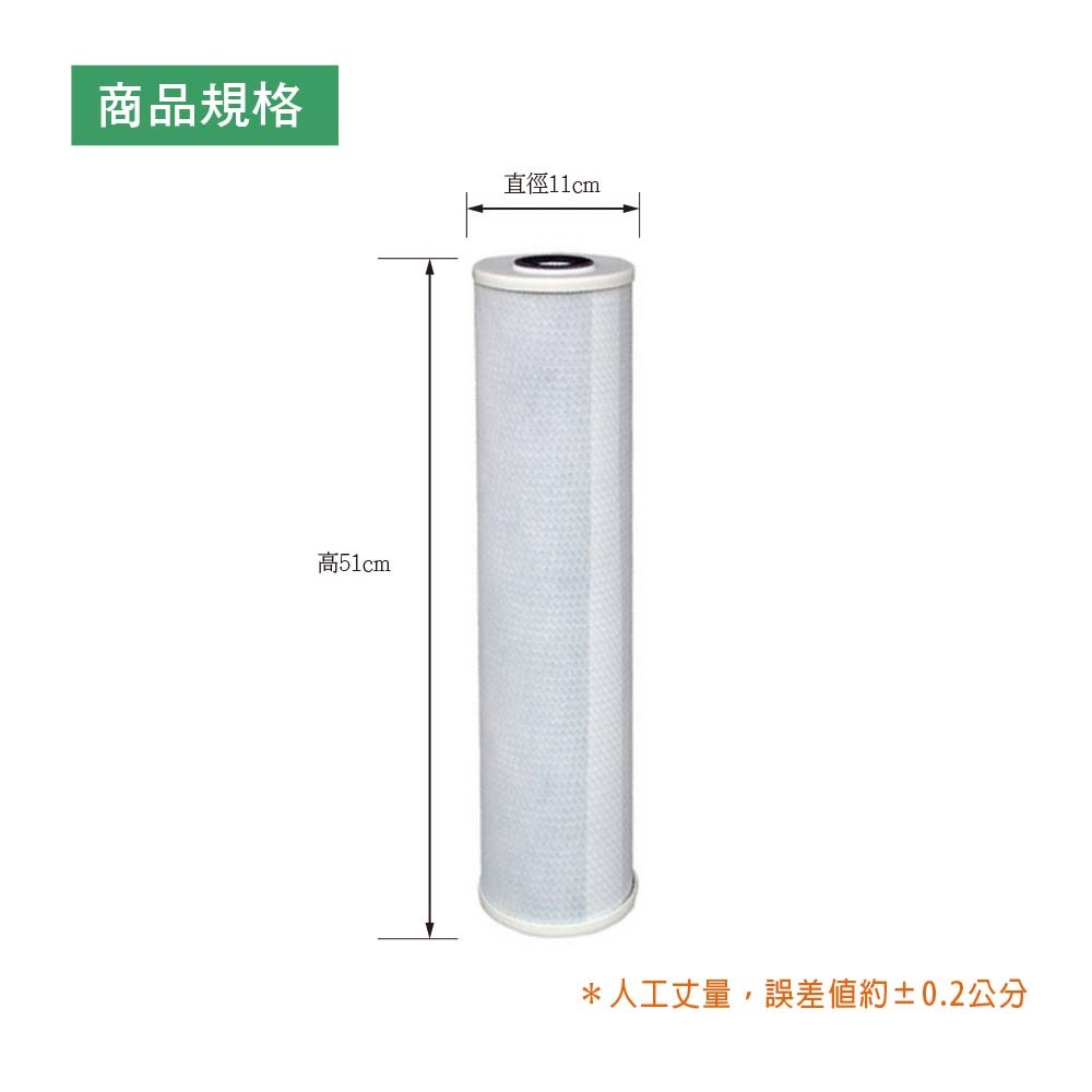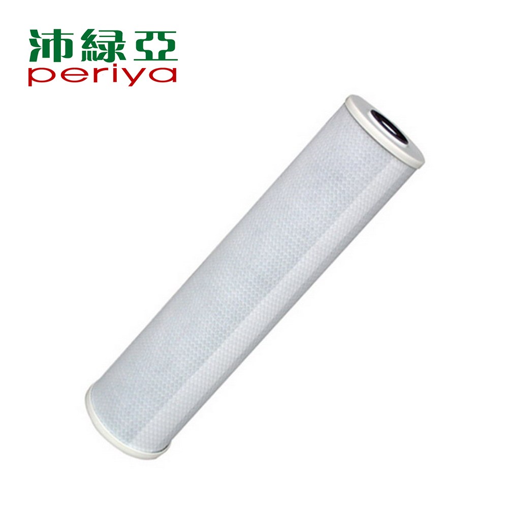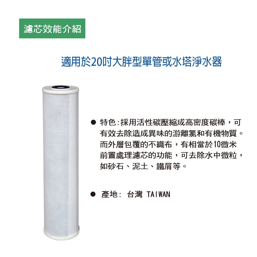 適用於20吋大胖型單管或水塔淨水器,採用活性碳壓縮成高密度碳棒,可有效去除造成異味的游離氯和有機物質。而外層包覆的不織布,有相當於10微米前置處理濾芯的功能,可去除水中微粒,如砂石、泥土、鐵屑等。