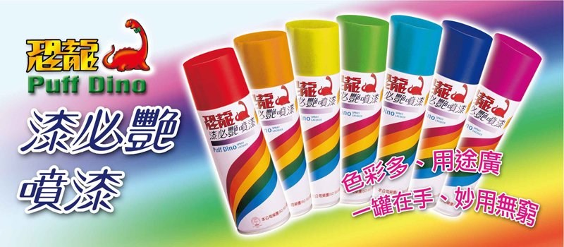 "厭倦了色彩單調的生活嗎?就讓【恐龍漆必豔】來為您著上繽紛色彩吧!使用方便,輕輕一噴,金屬、木器、 傢俱等表面輕鬆著色,色彩鮮艷持久。具防鏽效果,耐候性佳,更能豐富您的彩色生活唷!"