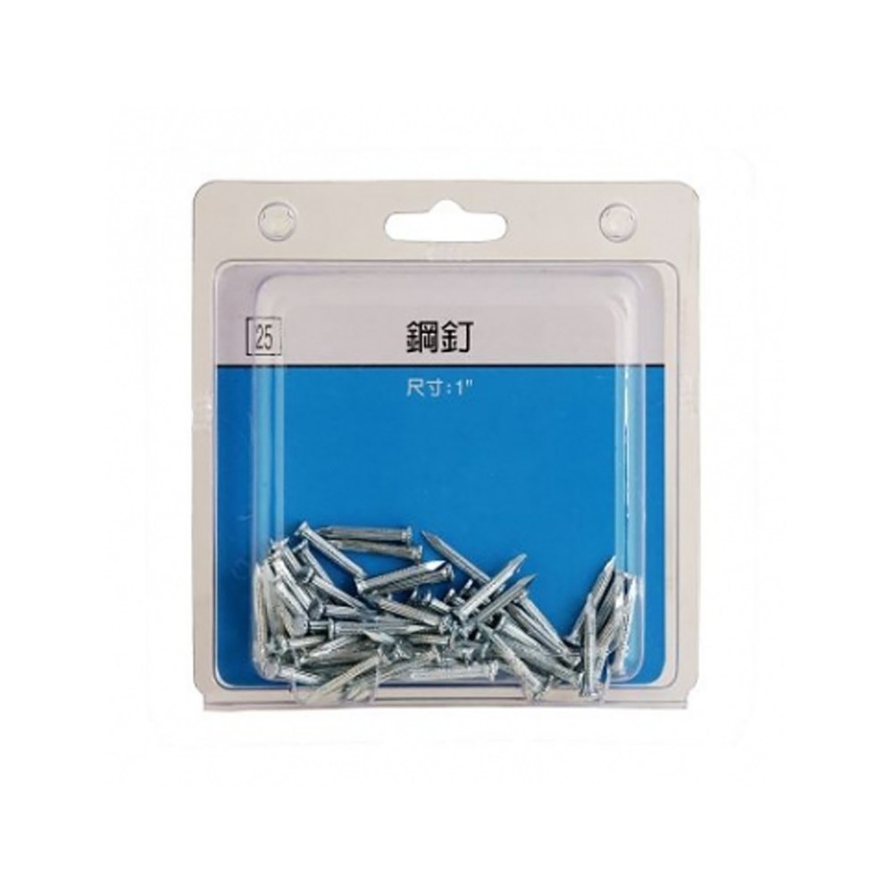 居家DIY的好幫手這款【25 鋼釘盒裝 1" 】,本體以鋼製造,材質堅固耐用,長久敲擊使用不易變形,側邊設計有直條邊紋,可用來增加磨擦力以加強牢度,可使用在一般水泥牆面施工等,讓您施工更方便!
