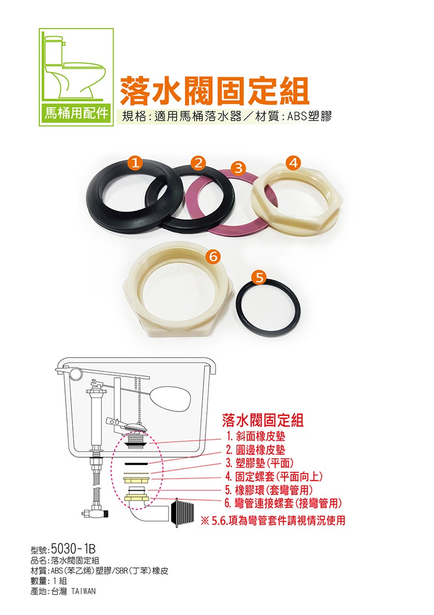 改造馬桶不可或缺的零件,落水閥固定組,螺絲雖小,可是功能卻很重要,好的落水閥固定組,可以讓您的水管更加耐用,不易漏水,這款兩件式的落水閥,適用於一般的分離式水箱,安裝方式簡易,固定組為塑膠材質,及橡皮圈墊片,可防止水的滲漏,是台灣製造的優質商品。