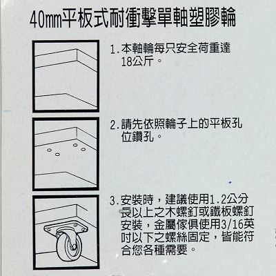 這款【40MM 平板式塑膠傢俱腳輪】可輕易搭配木板組合,就是一個簡易托板車,或替換托板車的腳輪,亦可搭配任意的檯面,做移動的輪組。強化的塑膠輪組,安全耐用,每只安全荷重可達18kg,圓形的輪胎,轉向更加靈活,平板式四角螺絲固定安裝方式,更換迅速容易,不易鬆動。