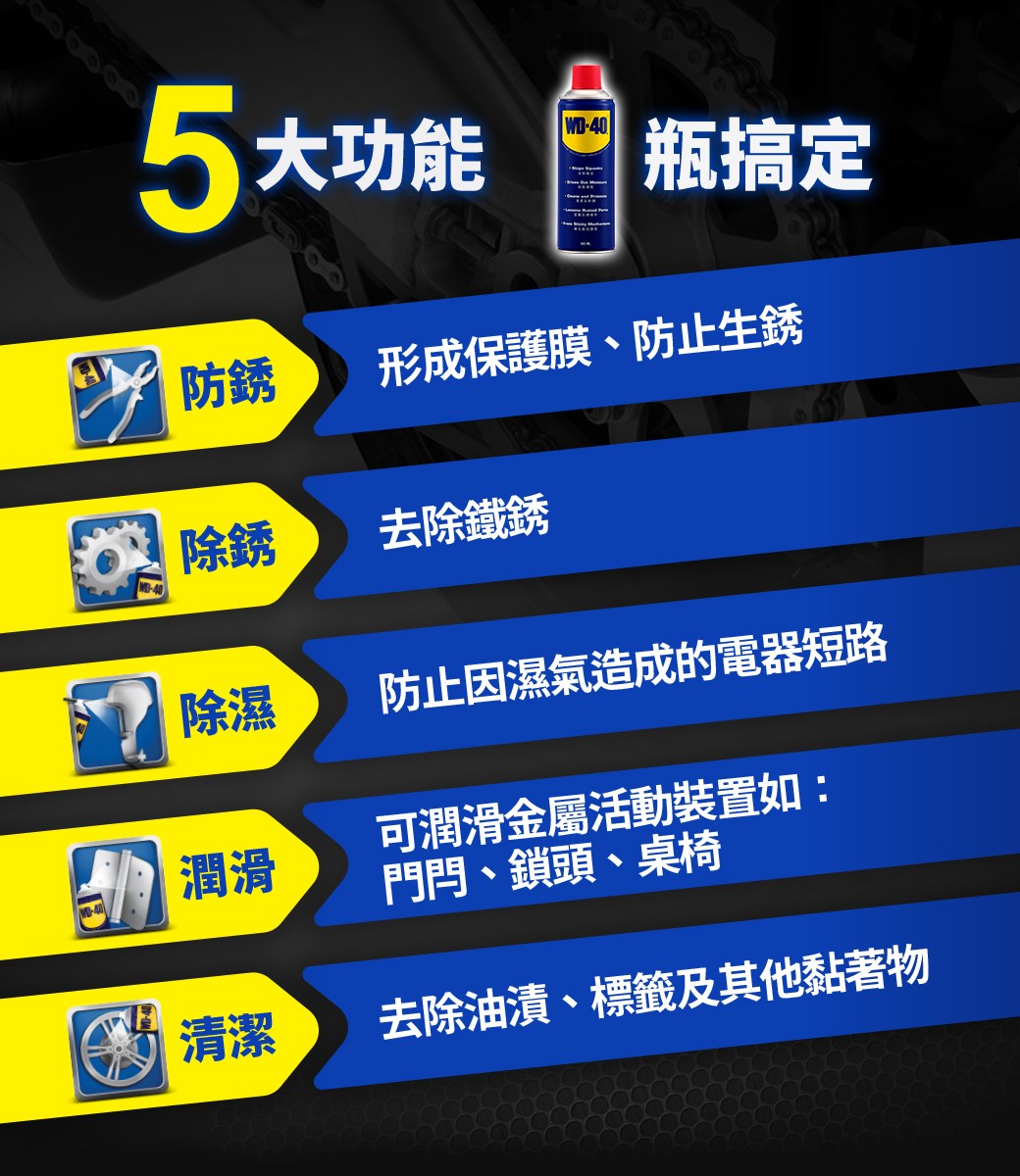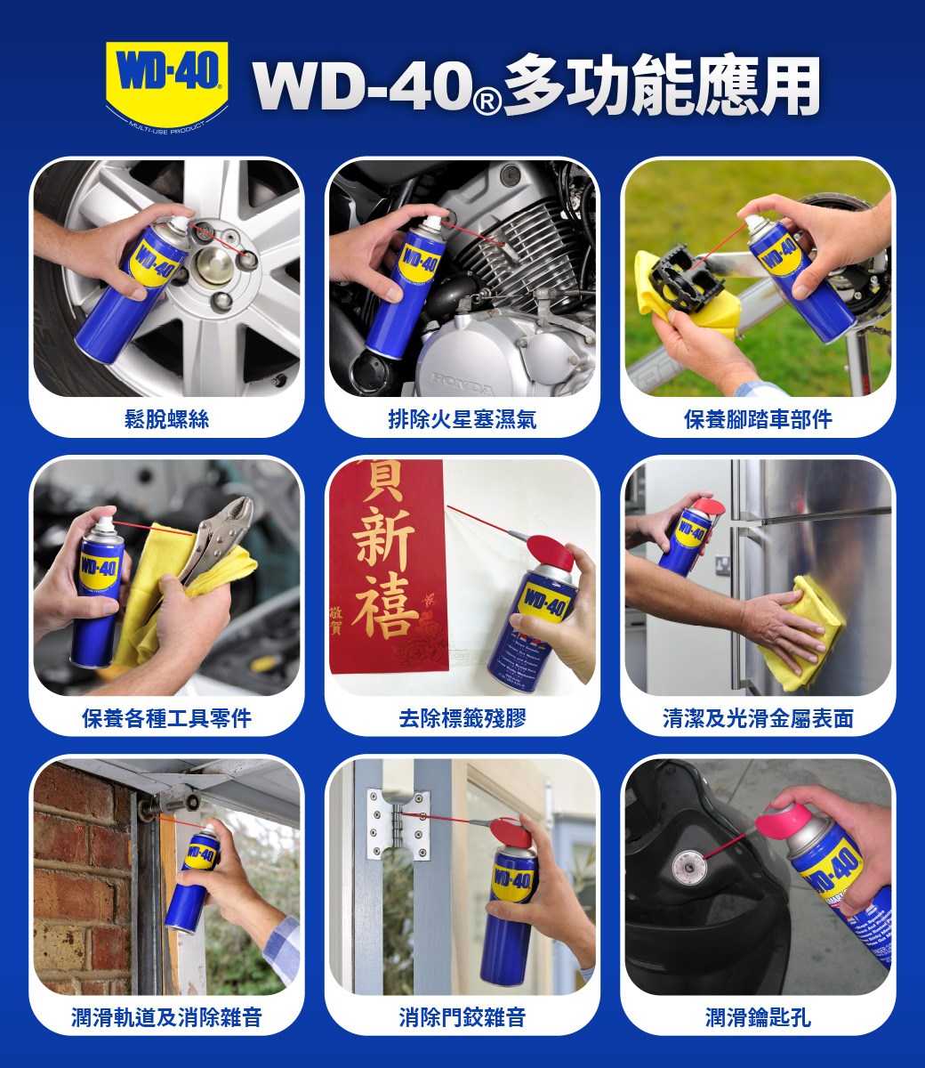 針對各種金屬製品做保養維護。只要輕輕一噴,不但能形成保護膜,避免生鏽,若噴灑於已生鏽的金屬製品上,還能除鏽、鬆解生鏽螺絲!讓您解決金屬生鏽的問題!
