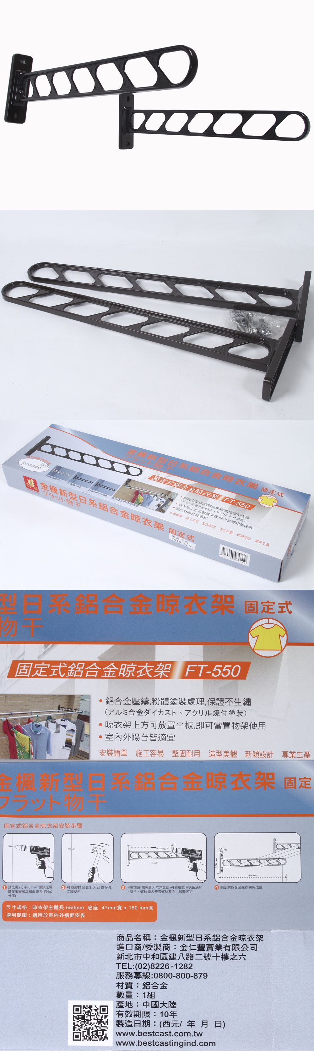 這款【固定式鋁合金晾衣架FT-550】安裝簡單、施工容易,鋁合金壓鑄,粉體塗裝處理,保證不生鏽,主體430mm,上下伸縮範圍500~755mm適用於陽台挑高之建物。