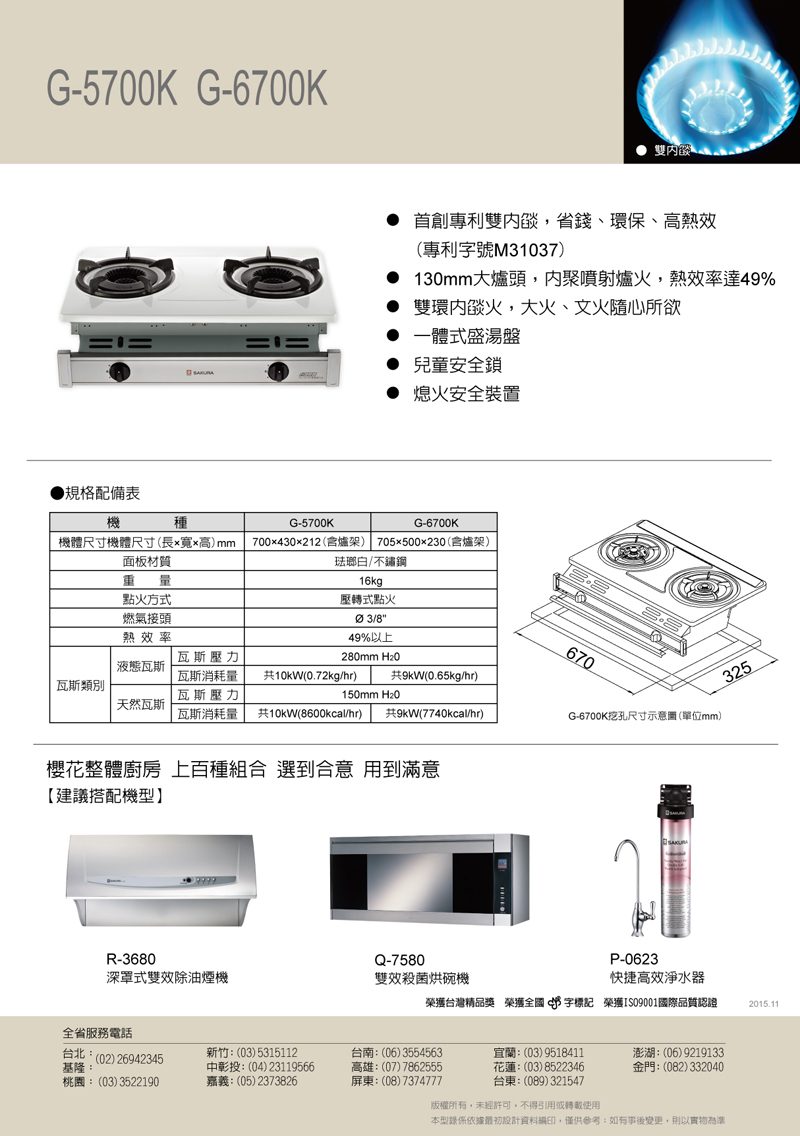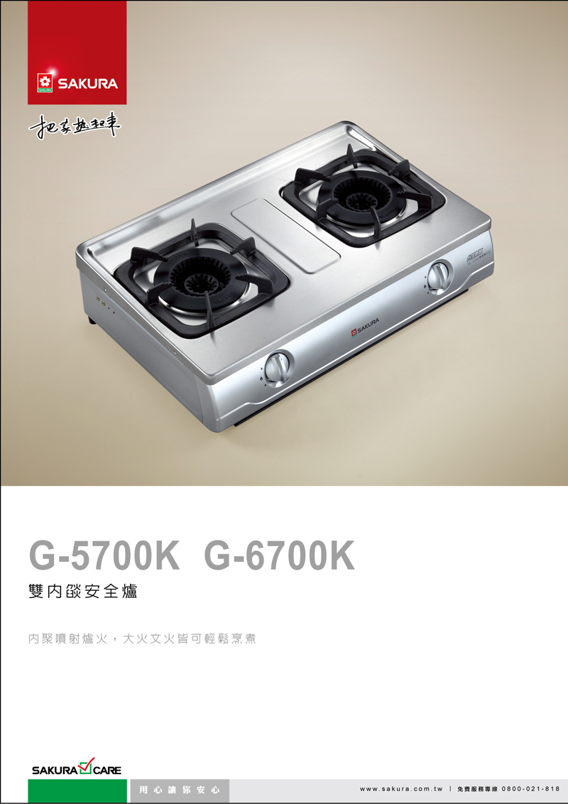 這款【櫻花 SAKURA 雙內焰安全嵌入爐 台灣新爐系列 G-6700K(NG1) [天然瓦斯]】為雙環雙內焰火力大,適合華人煮食料理烹煮習慣。同時附有兒童安全鎖,避免家中兒童好奇玩耍釀成大禍。此外,自動熄火安全裝置,保障您的使用安全。