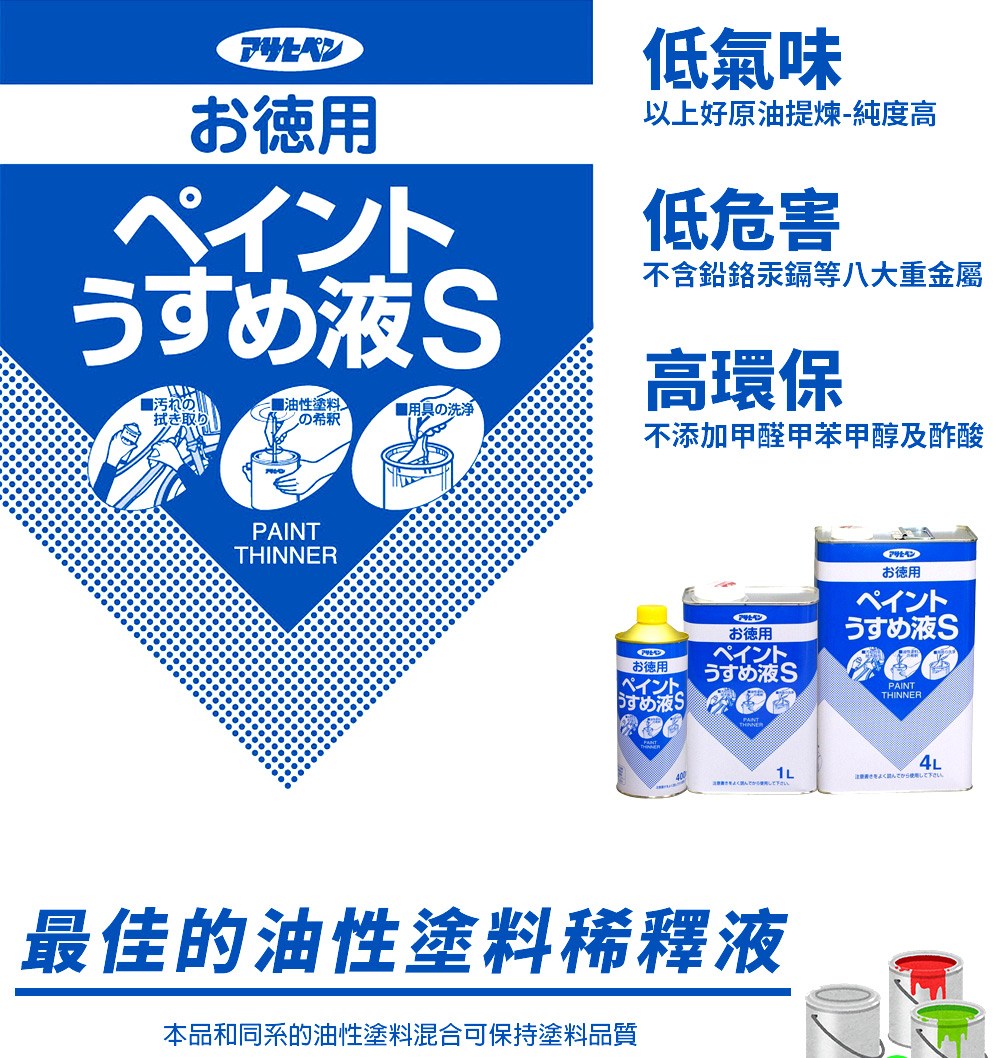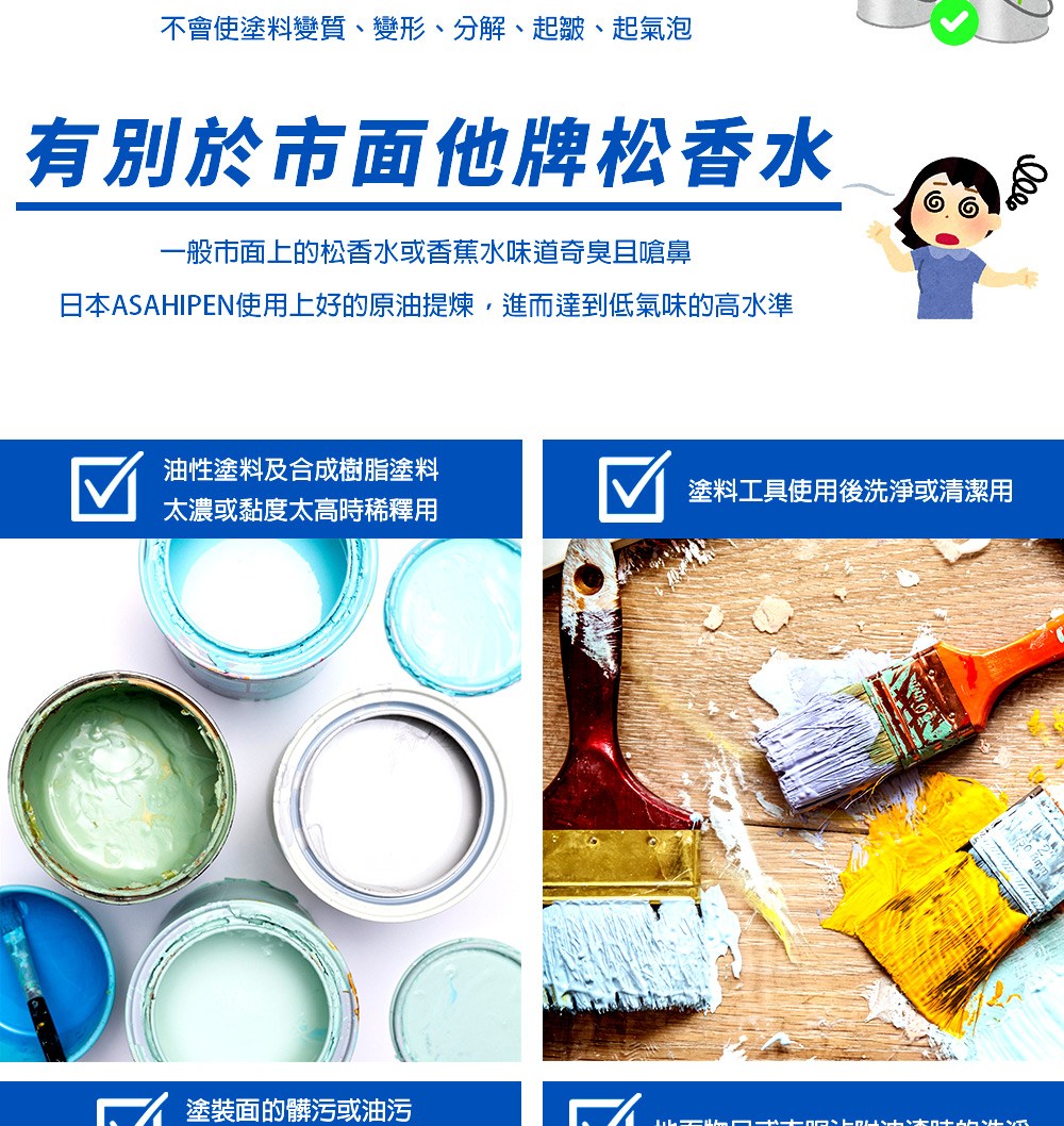 油漆施工除污的好幫手 這款【日本Asahi低味高環保松香水】,以高品質原油提煉製造,品質穩定濃度高,高環保!不添加甲醛、甲苯、甲醇及酢酸,傷害性低!不含鉛鉻汞鎘等八大重金屬,不會引起重金屬慢性中毒,讓您使用更安心。適合合成樹脂塗料及油性塗料稀釋液、溶劑、油漆面髒污擦除、木脂去除用以及油漆工具洗淨用,最佳油性塗料稀釋液!本品和同系的油性塗料混合可保持塗料品質,不會使塗料變質、變形、分解、起皺、起氣泡。是您施工裝潢的最佳選擇。