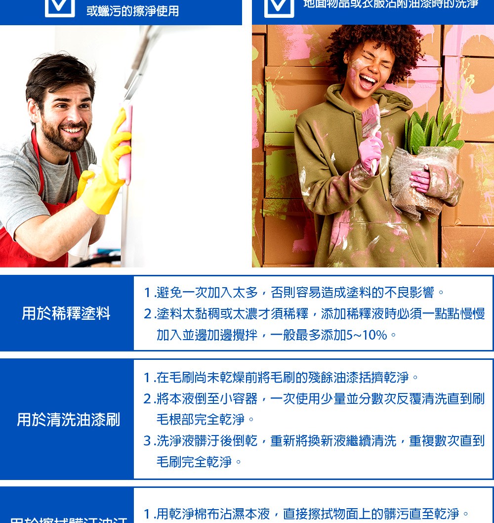 ●油性塗料及合成樹脂塗料太濃或黏度太高時稀釋用