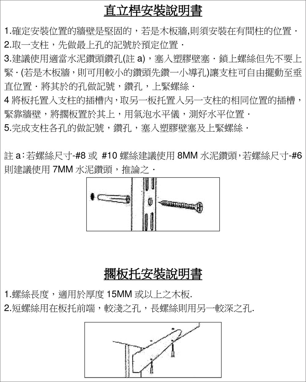 若裝置在木板上,即螺絲直接鑽孔,孔洞大小為所使用螺絲直徑尺寸