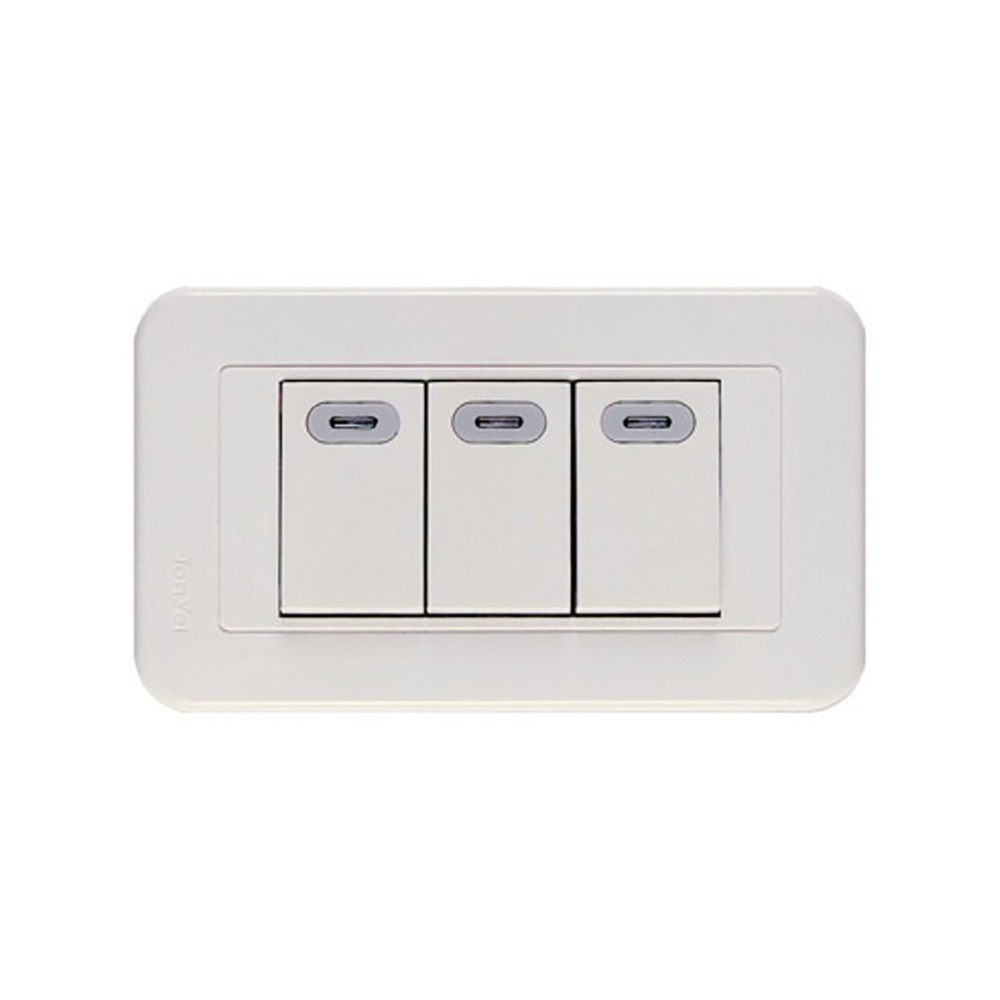 這款【PANDA三開關蓋板組】,白色大面切取代傳統牙黃小面切開關,除提升質感外,讓手切換時觸碰面積大而更好切,開關均為單三路燈光迴路接法共用型,因夜燈周圍有灰色外圈,因而取名熊貓開關。