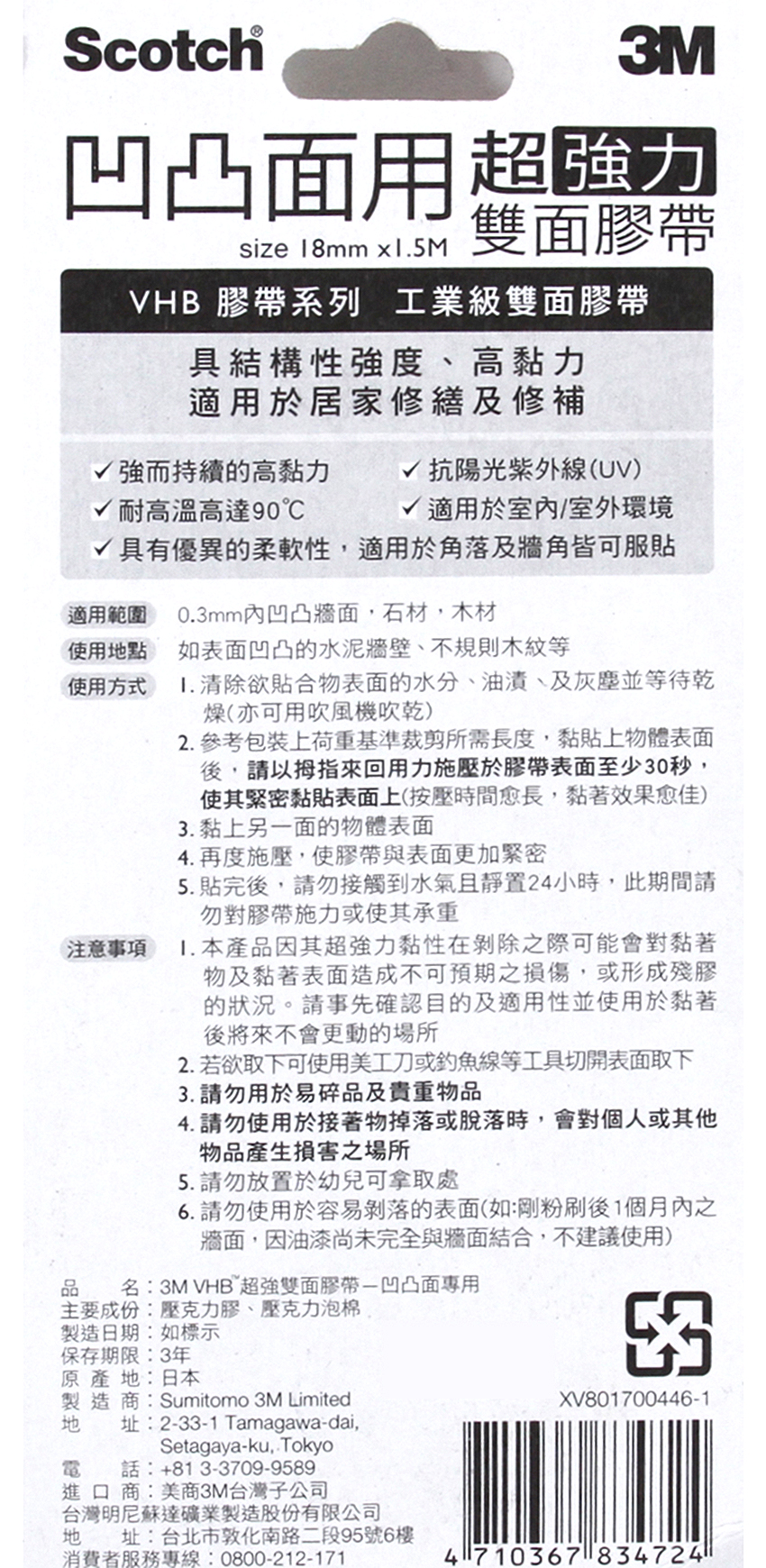 - 【3M-Scotch】超強力雙面膠帶(18mm),超強黏性~適用於粗糙/凹凸表面,((寬18mmx總長1.5M))!