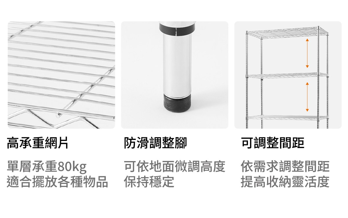 特力屋提供木質、鍍鉻或是塑鋼等多種不同材質的選擇,層架可延伸擴增,符合客廳、廚房、臥室、戶外等不同空間與風格的需求。特力屋提供的層架皆通過認證單位SGS的承重測試,確保層架的使用安全,簡易安裝即成為居家收納的好幫手。