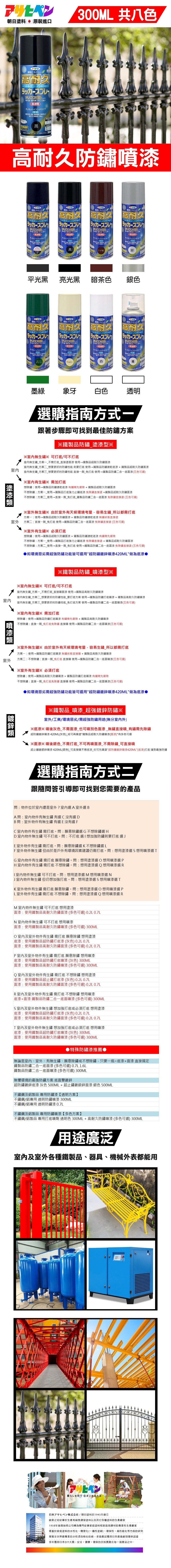 超速乾,防鏽能力佳 想讓物品煥然一新嗎?這款【高耐久無鉛苯防鏽噴漆墨綠】適用於室內外家具、電器、鐵門、柵欄、鐵件、自行車、機車、機械、器具等鐵製品和木製品,耐久防鏽、耐日曬雨淋、耐海島型氣候、耐酸雨、耐紫外線照射超速乾、不垂流。成分中不添加甲苯、二甲苯、可塑劑 製造過程不添加鉛鉻汞鎘等八大重金屬,既環保,又能達到美化作用。