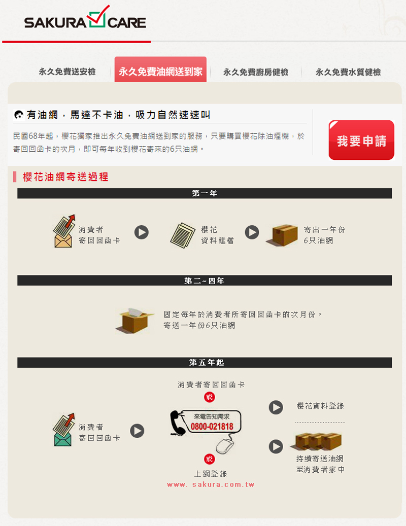 此外,櫻花永久免費油網送到家服務,只要購買櫻花除油煙機,於寄回回函卡的次月,即可每年收到櫻花寄來的6只油網!