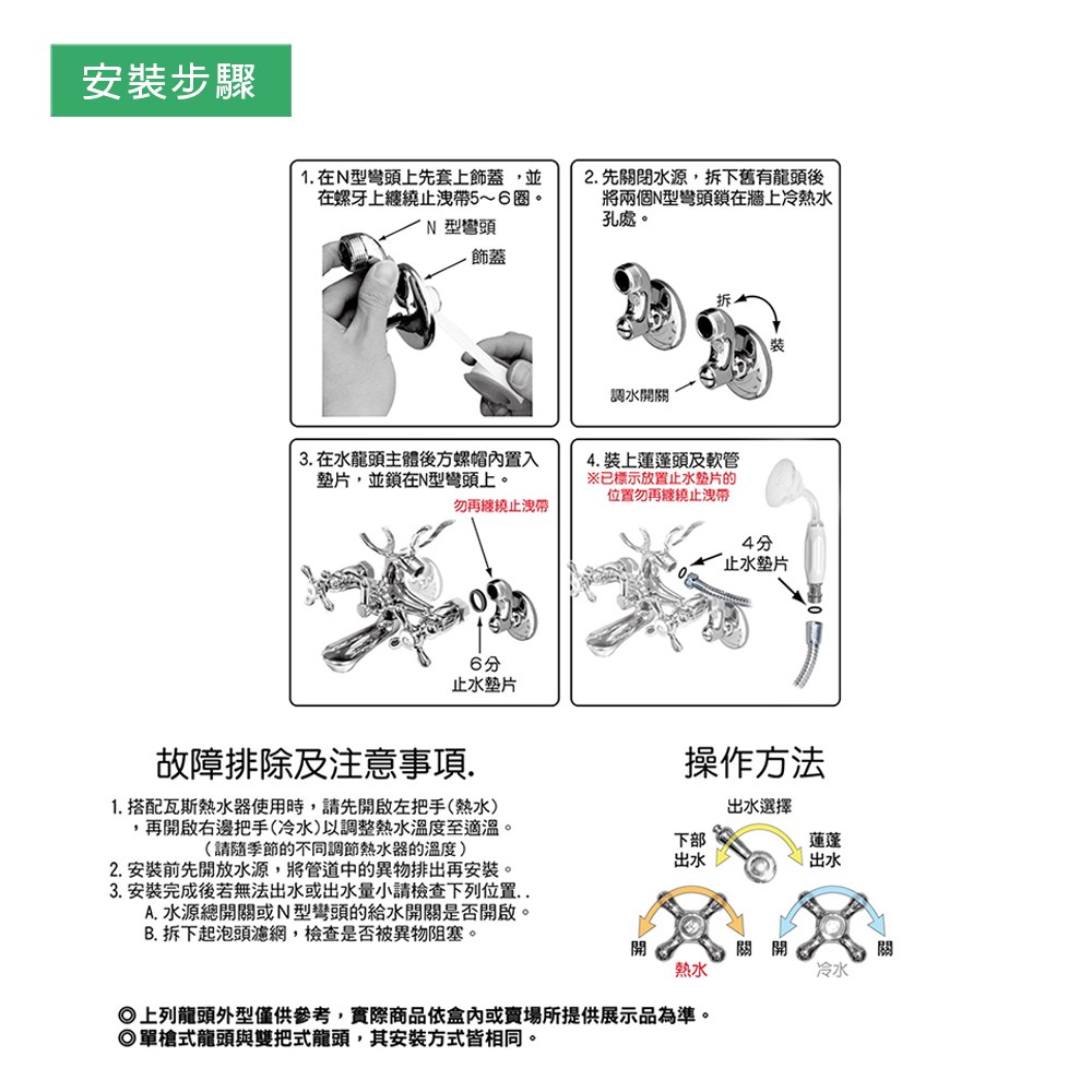 5. 本商品僅限搭配蓮蓬頭使用,搭配可暫時止水或開關型蓮蓬頭時,應於使用後務必關閉水龍頭開關(避免造成水管破損或漏水)。