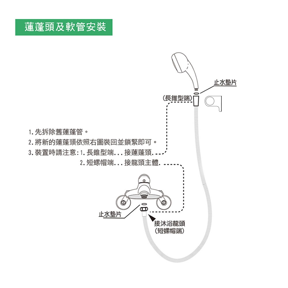 3. 軟管因長時間裝置於包裝內而可能產生暫時性的變型,建議您在安裝後開啟熱水流通大約1~2分鐘,待受熱軟化後,再開冷水給予冷卻,即可恢復。