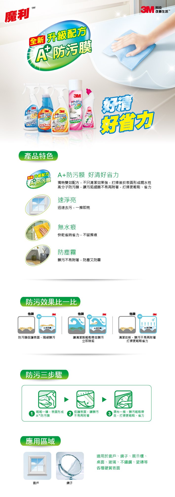 這款【3M魔利玻璃亮光劑】,特殊配方,擁有清潔、防霧、防塵、亮光及不留水痕五大功能,長時間保持清新明亮。沒有刺鼻的怪味,避免大量噴灑後吸入過多的化學物質,影響健康。適用於窗戶、鏡子、展示櫃、桌面、玻璃、不銹鋼、瓷磚等各種硬質表面,讓您家更光亮潔淨!