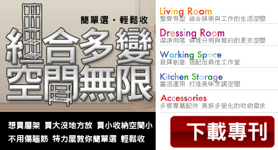 特力屋提供木質、鍍鉻或是塑鋼等多種不同材質的選擇,層架可延伸擴增,符合客廳、廚房、臥室、戶外等不同空間與風格的需求。特力屋提供的層架皆通過認證單位SGS的承重測試,確保層架的使用安全,簡易安裝即成為居家收納的好幫手。