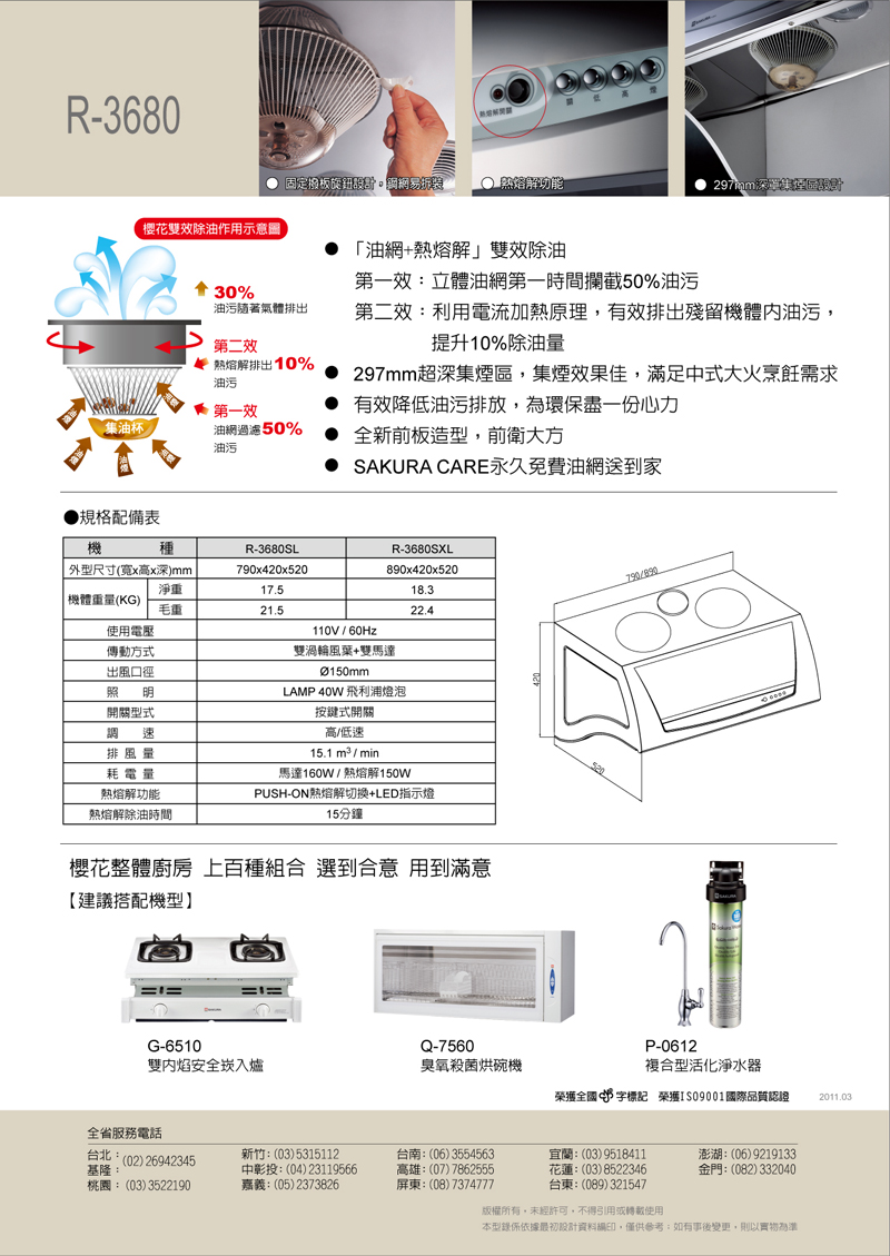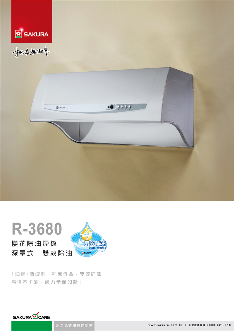 油煙機最麻煩的就是清潔問題,本款【櫻花 SAKURA 深罩式除油煙機(雙效除油) W80CM R-3680SL [不鏽鋼]】能夠「油網+熱熔解」雙效除油,讓油煙機更乾淨、壽命更長久。